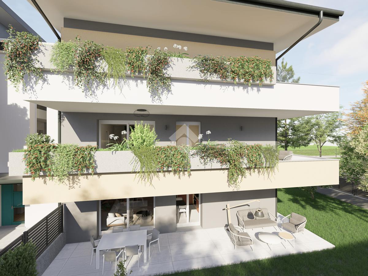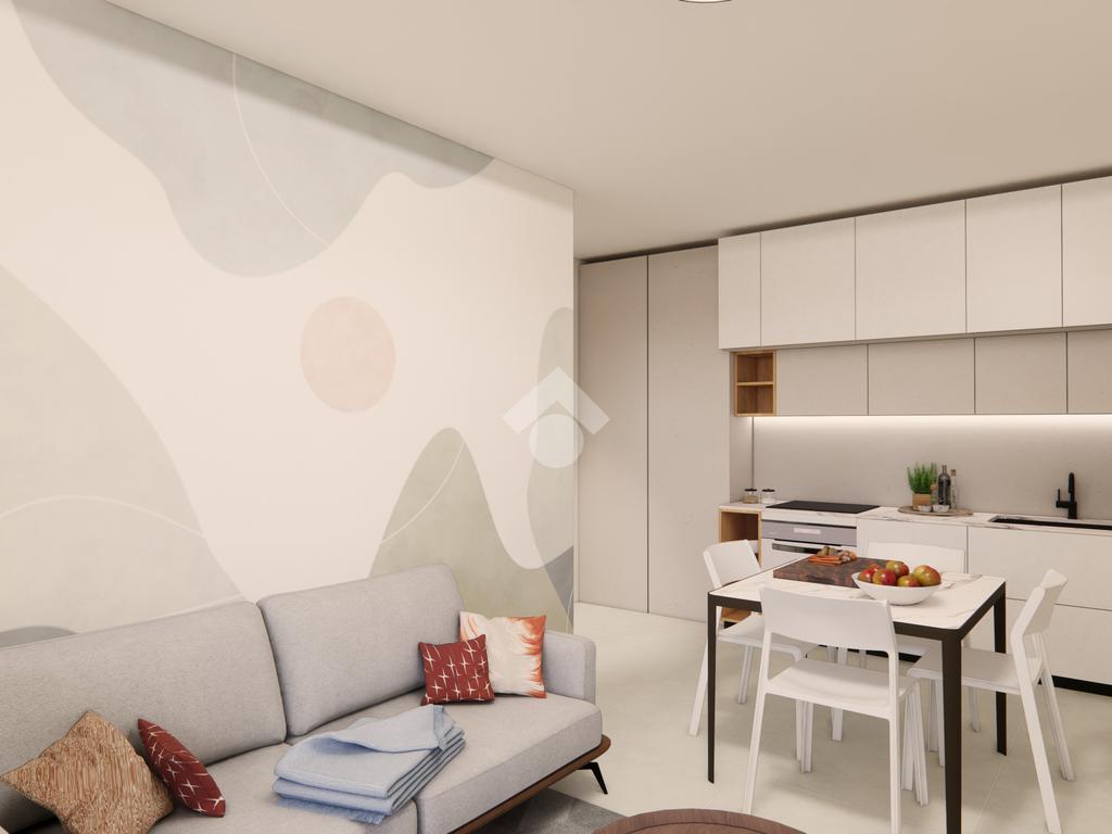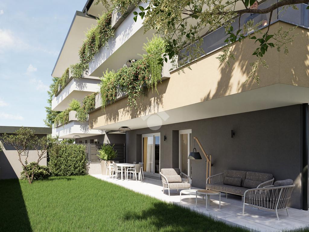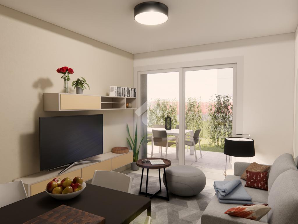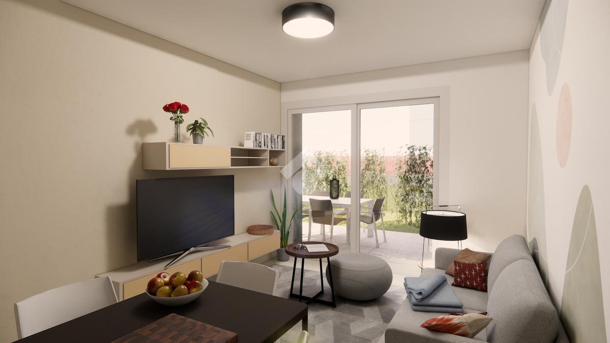 La soluzione con design moderno è composta dal soggiorno con cucina a vista, dalla camera matrimoniale, dai doppi servizi, e dal giardino privato di 156 mq oltre ad portico di 30 mq.