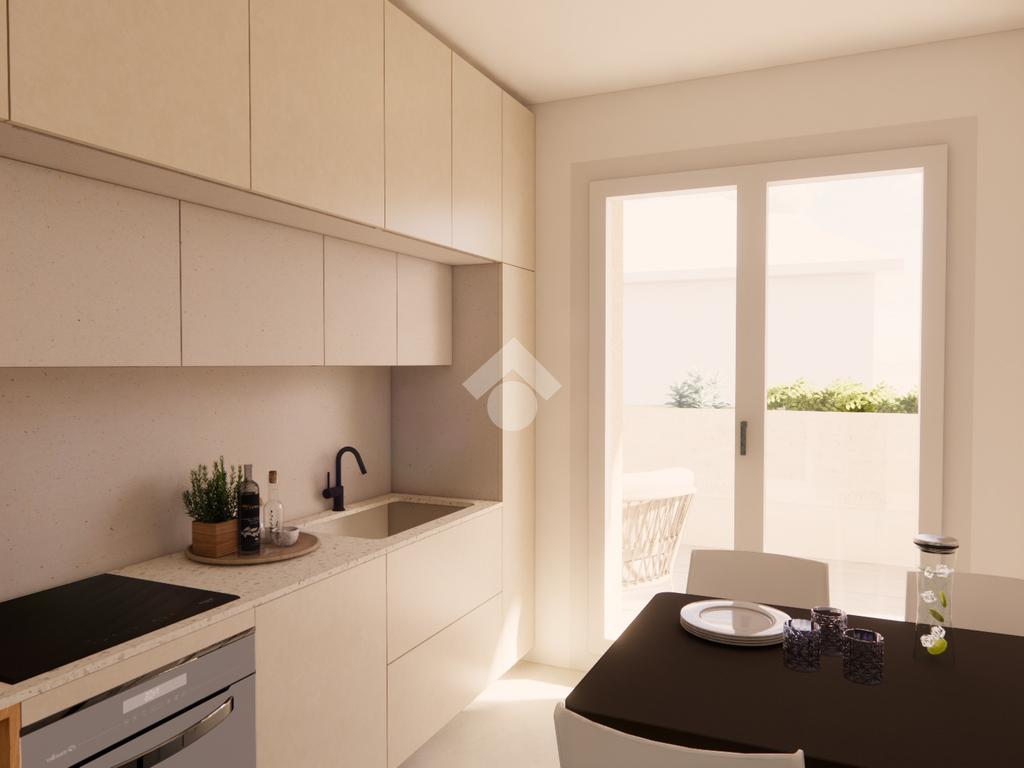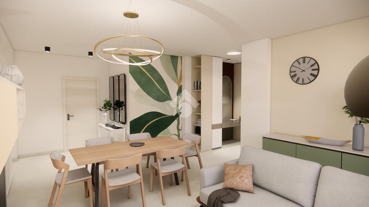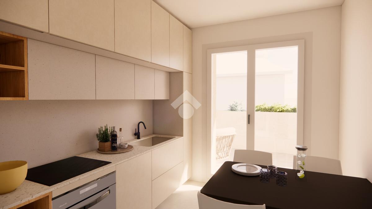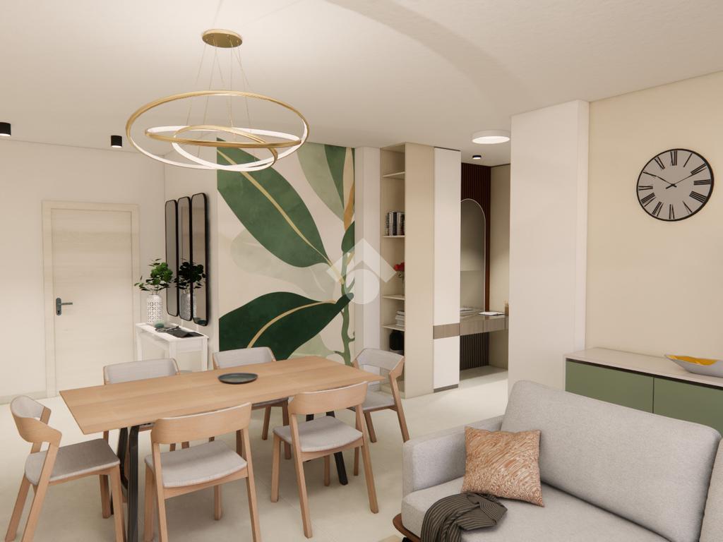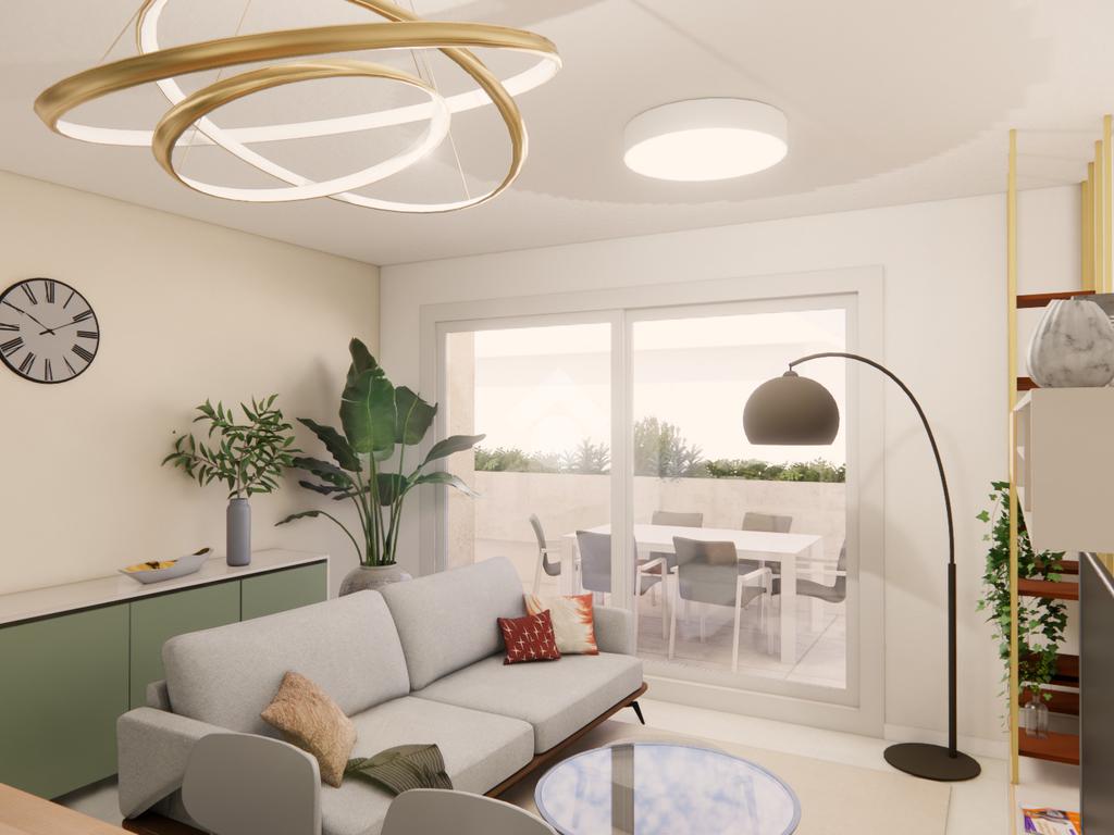 La soluzione con design moderno è sita al primo piano ed è composta dal soggiorno, dalla cucina abitabile, da due camere da letto, dal ripostiglio, da due bagni entrambi finestrati e dal terrazzo privato di 33 mq.