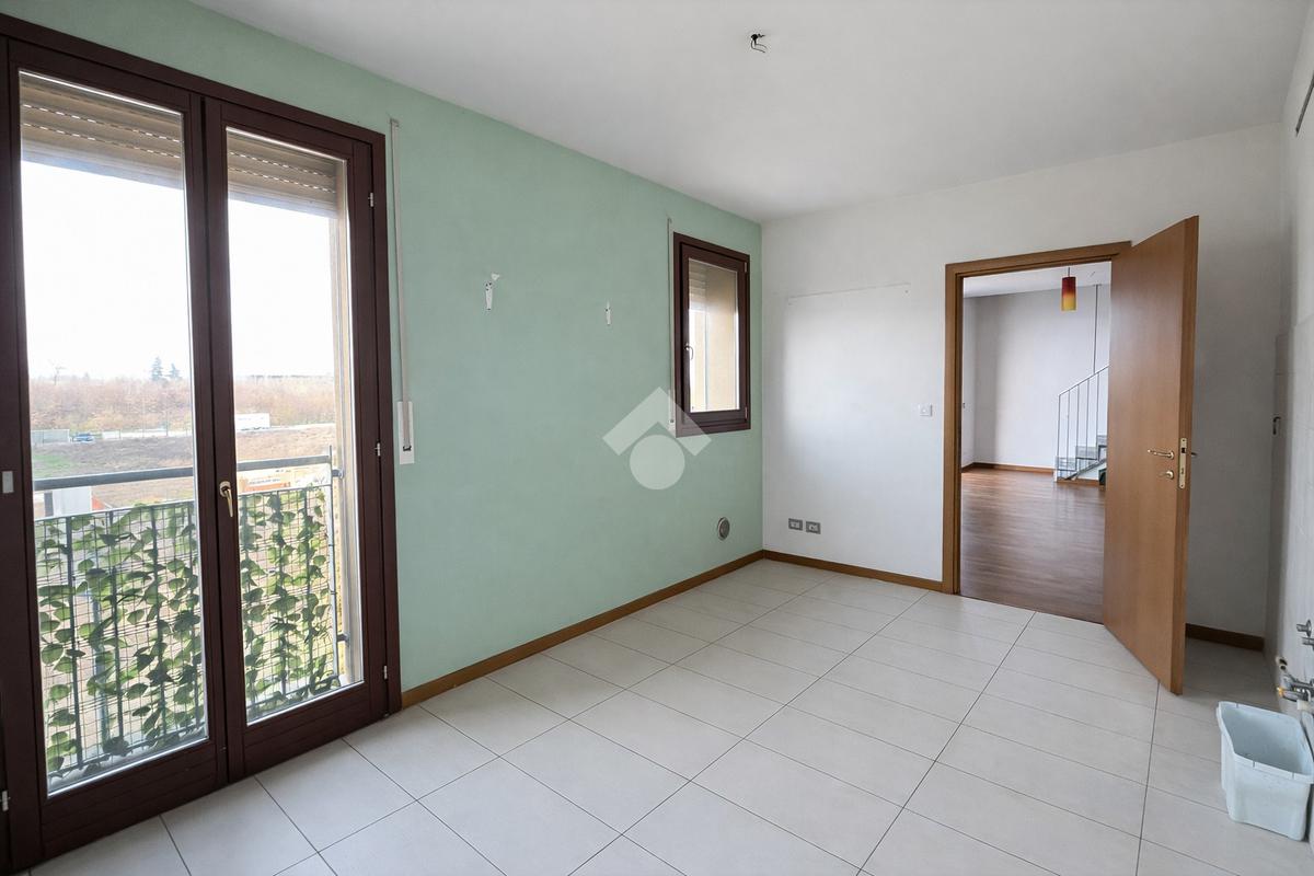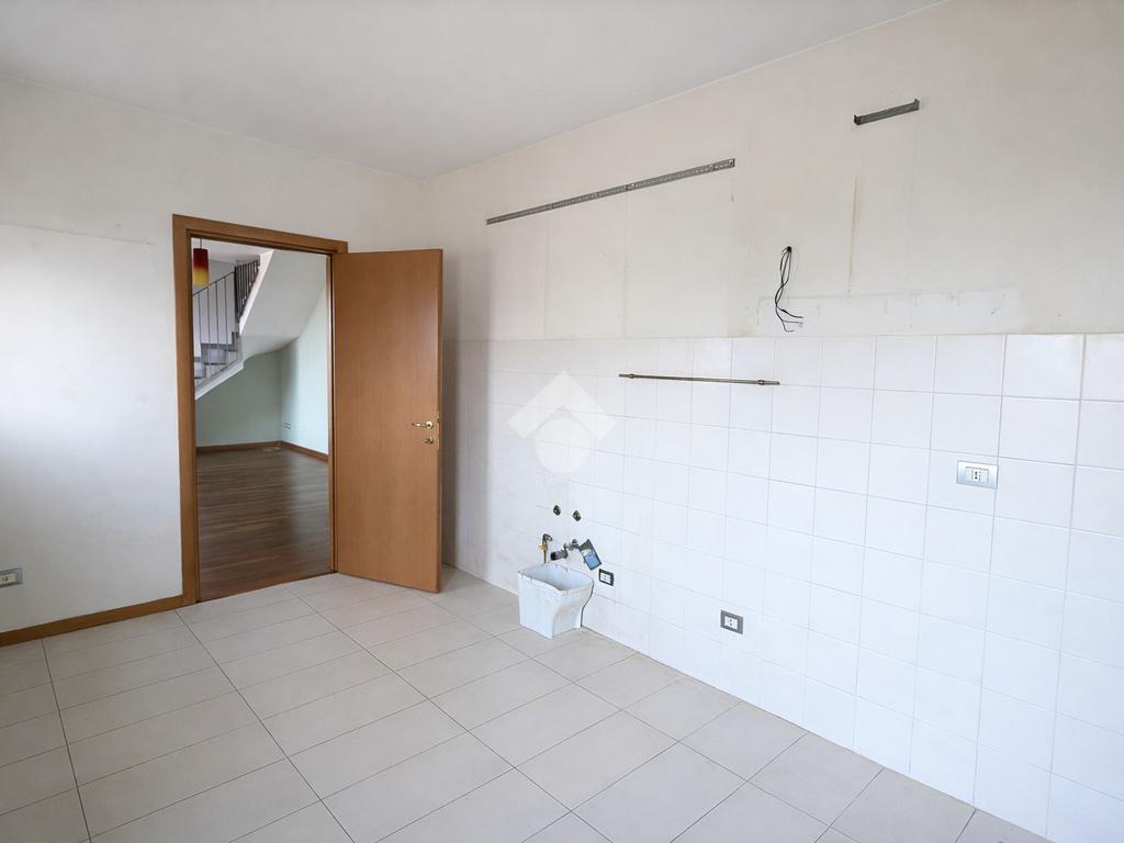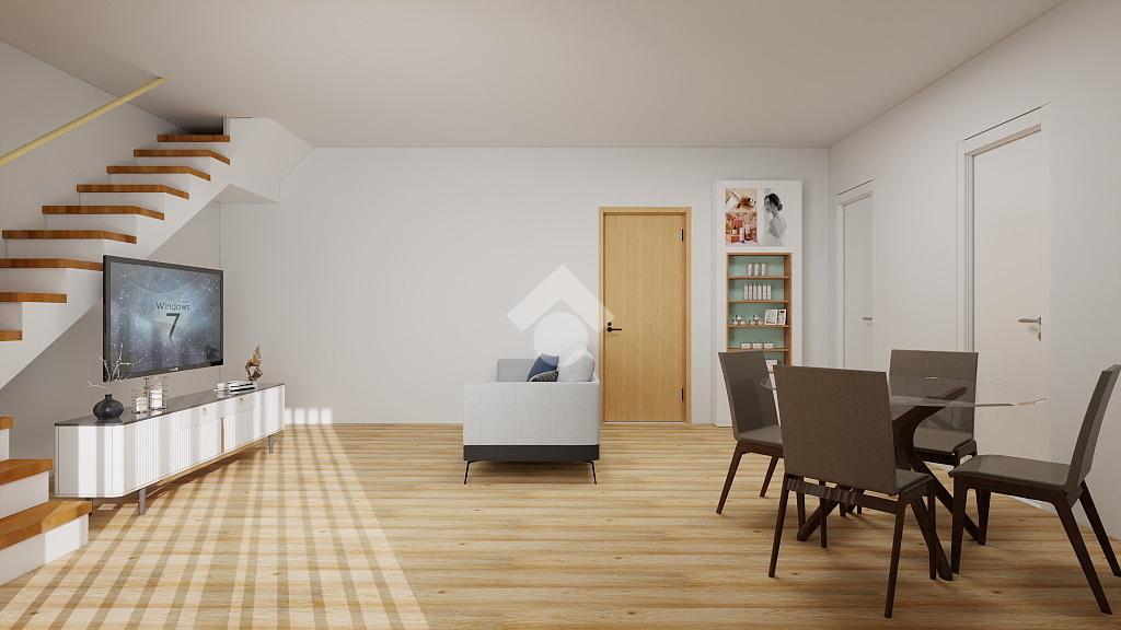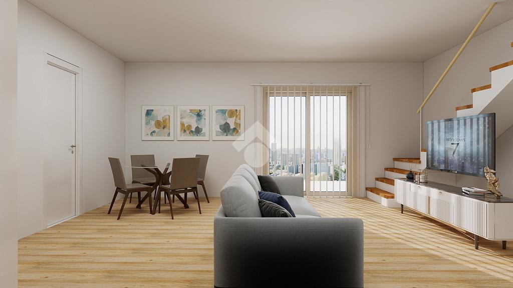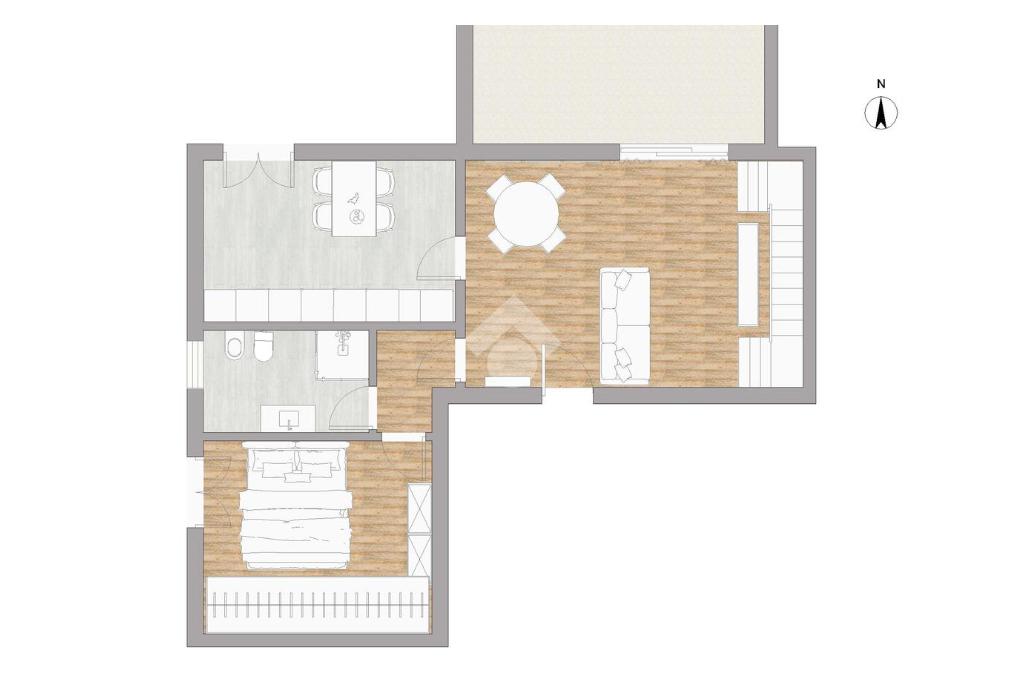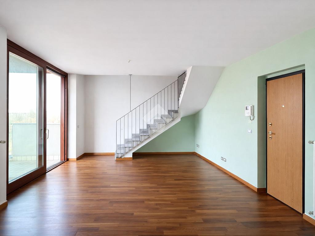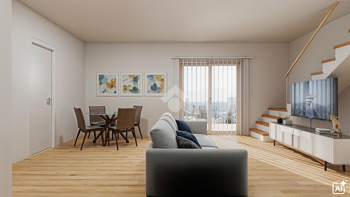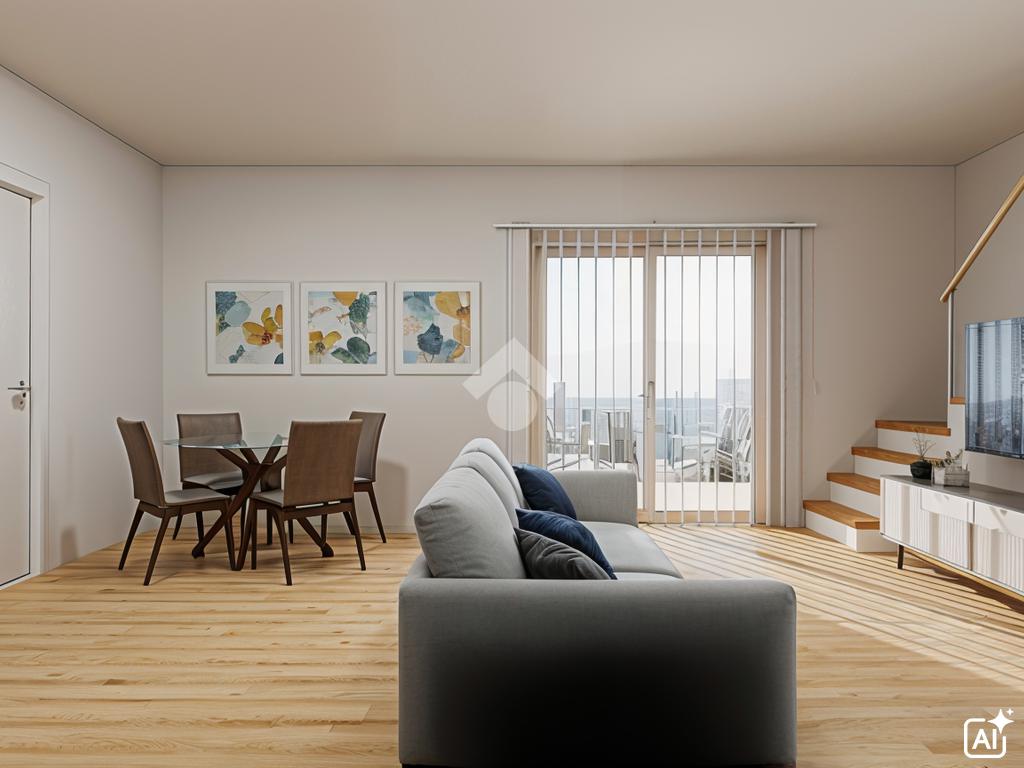 Al primo livello si sviluppano l’ampio soggiorno e la cucina abitabile, entrambi con accesso al terrazzo, una comoda camera da letto ed un bagno finestrato.