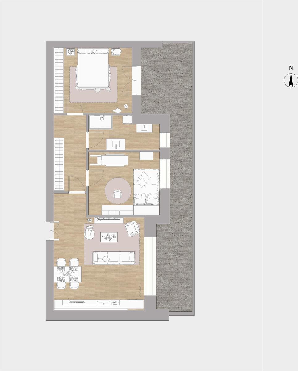 L'appartamento comprende un luminoso soggiorno con cucina, due camere, un bagno ed è compreso di cantina, con possibilità di acquistare box singolo o doppio.