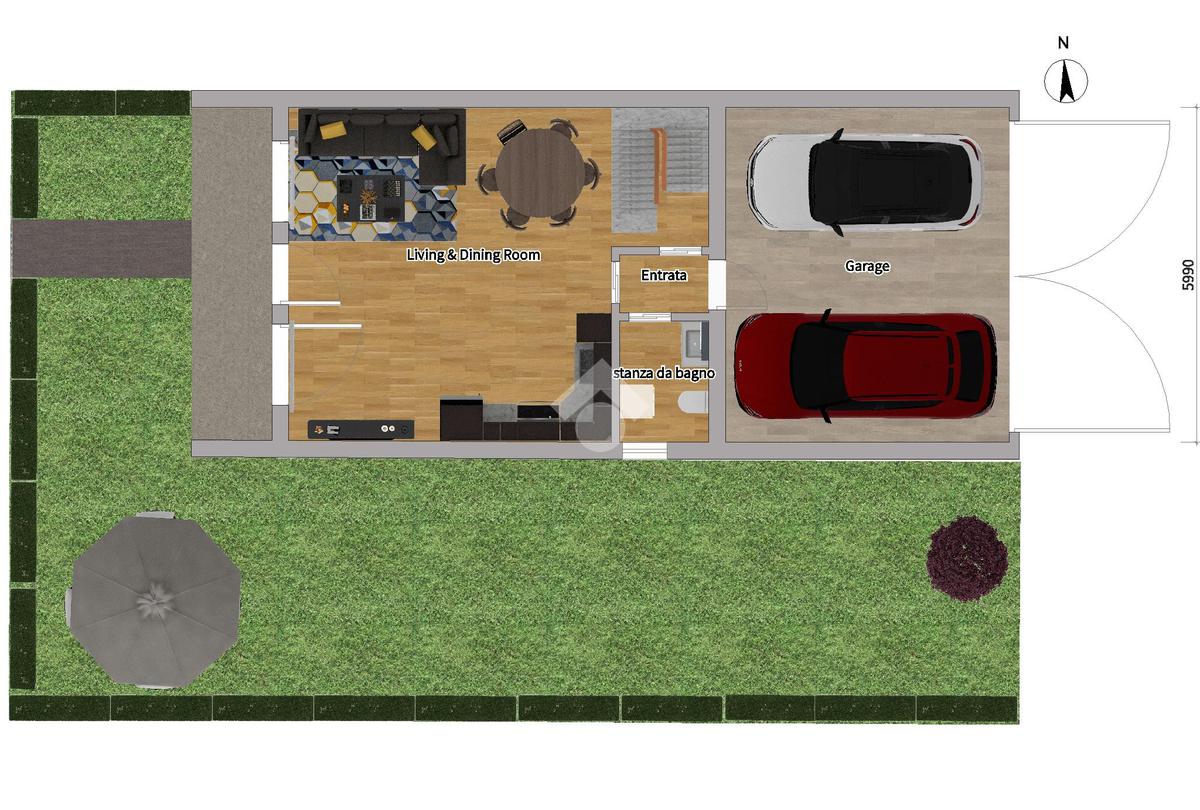 Al piano terra ti accoglie un ampio soggiorno inondato di luce, con cucina a vista e accesso diretto al giardino privato — perfetto per una colazione all’aperto, per far giocare i bambini in sicurezza o semplicemente rilassarti dopo una giornata piena.